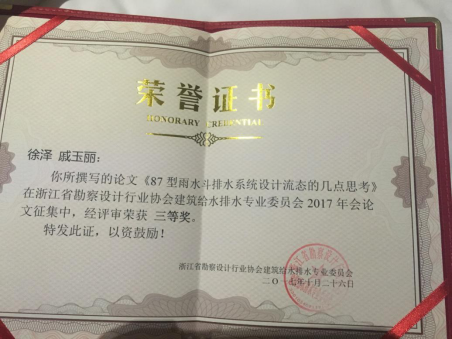 10月26-27日,浙江省勘察设计行业协会建筑给水排水专业委员会2017年会在宁波召开,由后宫电影院 戚玉丽老师(指导教师)和建环专业徐泽同学合作完成的《87型雨水斗排水系统设计流态的几点思考》荣获论文三等奖。