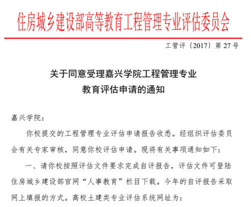 9月27日,住房与城乡建设部高等教育工程管理专业评估委员会下发《关于同意受理嘉兴学院工程管理专业教育评估申请的通知》(工管评【2017】第27号),同意受理后宫电影院