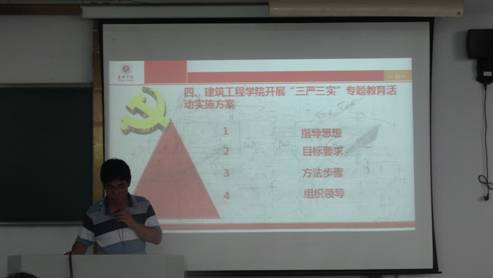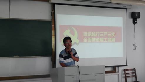 在越秀校区外语楼107教室举行“三严三实”专题教育党课,党委书记、院长蒋元海教授为全院教职工做“自觉践行三严三实、全面推进建工发展”的专题辅导。此次专题教育党课是根据校党委的统一部署和要求,落实《中共嘉兴学院委员会关于印发在处级以上领导干部中开展“三严三实”专题教育实施方案的通知》精神的重要活动。本月初,党委在全体师生党员中做“三严三实”活动动员和工作部署。