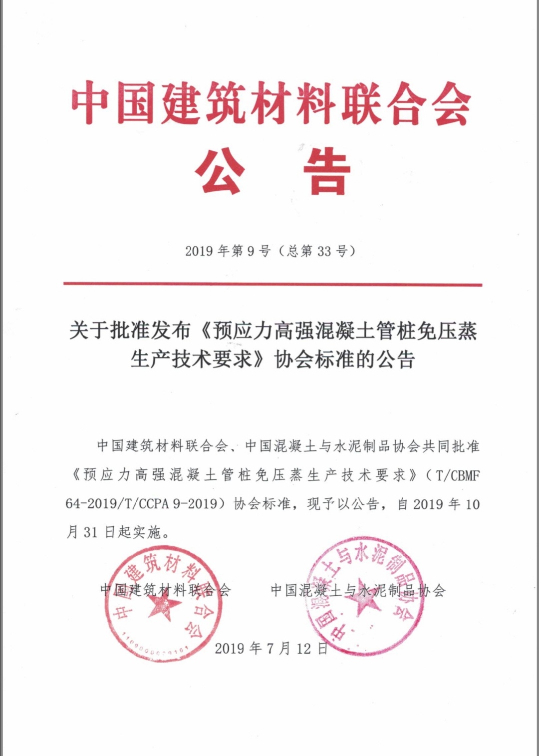 2019年7月12日,中国建筑材料联合会第9号(总第33号)文件“关于批准发布《预应力高强混凝土管桩免压蒸生产技术要求》协会标准的公告”,由嘉兴学院后宫电影院 负责起草的《预应力高强混凝土管桩免压蒸生产技术要求》(T/CBMF 64-2019,T/CCPA 9-2019)团体标准于2019年7月12日发布,将于2019年10月31日实施。