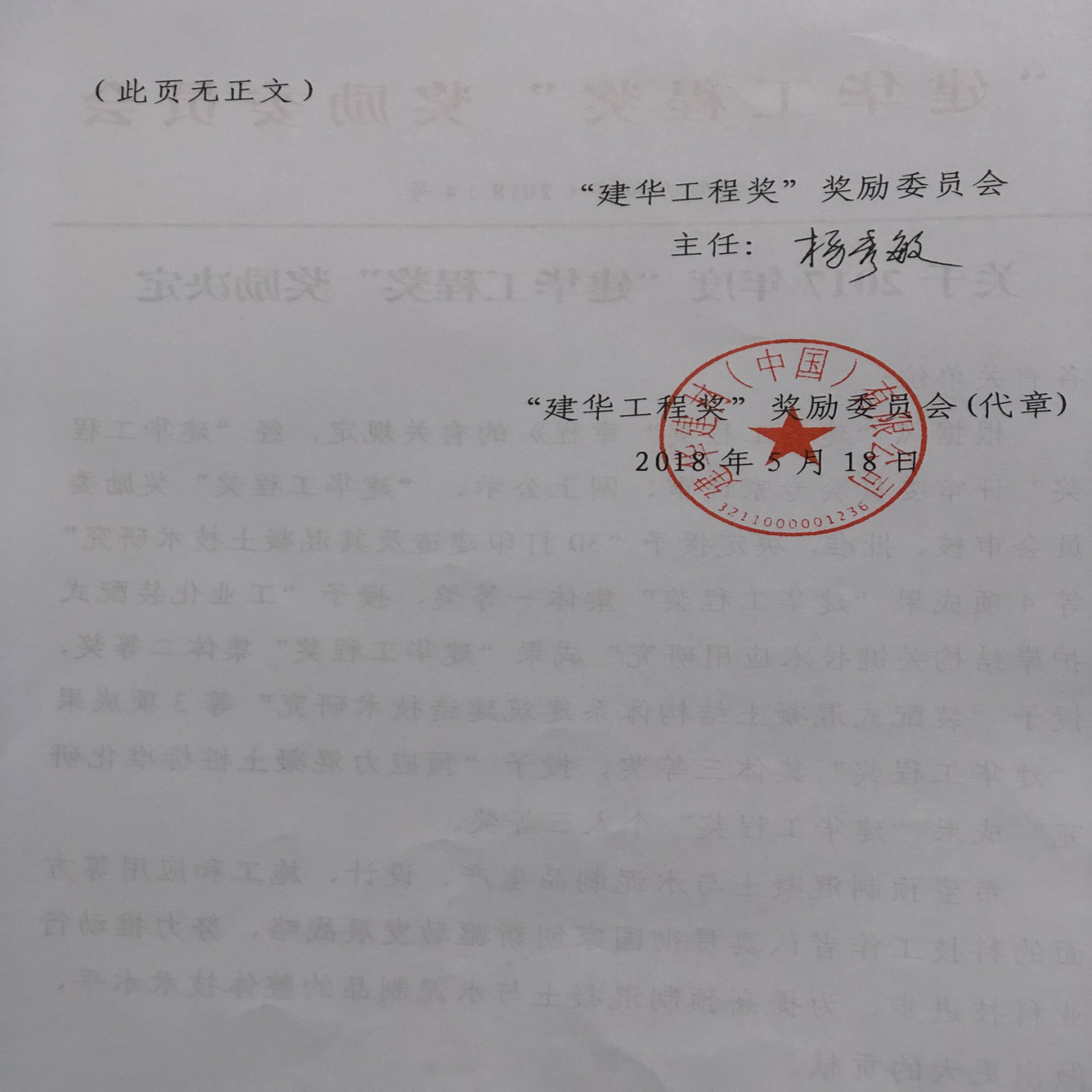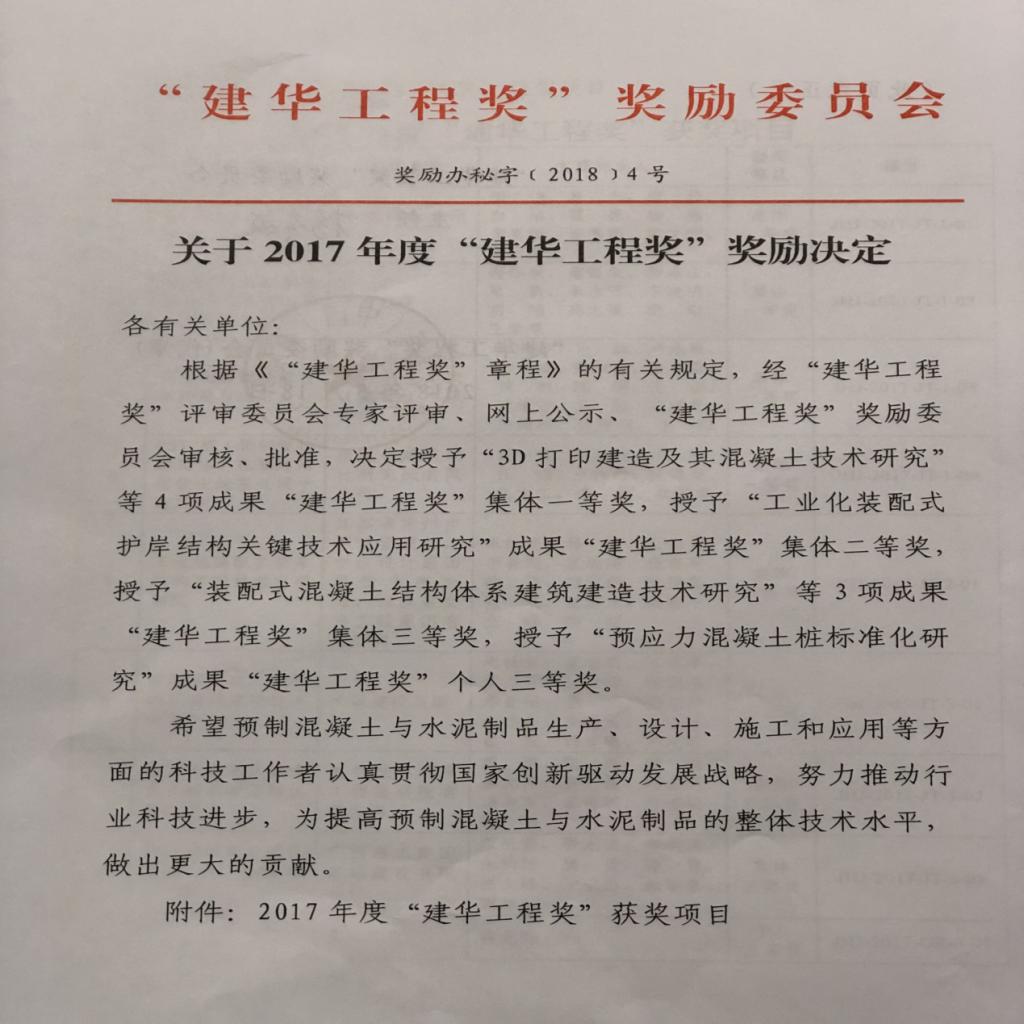“建华工程奖”是为贯彻国家科技创新战略,提高预制混凝土制品技术水平,加快预制混凝土制品行业进步,带动相关产业发展,促进科技成果转化,充分调动广大科技人员积极性和创造性,依据《国家科学技术奖励条例》和《社会力量设立科学技术奖管理办法》有关规定,而设立的行业内权威奖项,该奖项每年由“建华工程奖”奖励委员评审一次,第四届“建华工程奖”奖励委员会由28位中国工程院院士和13位本行业及相关行业专家组成。
