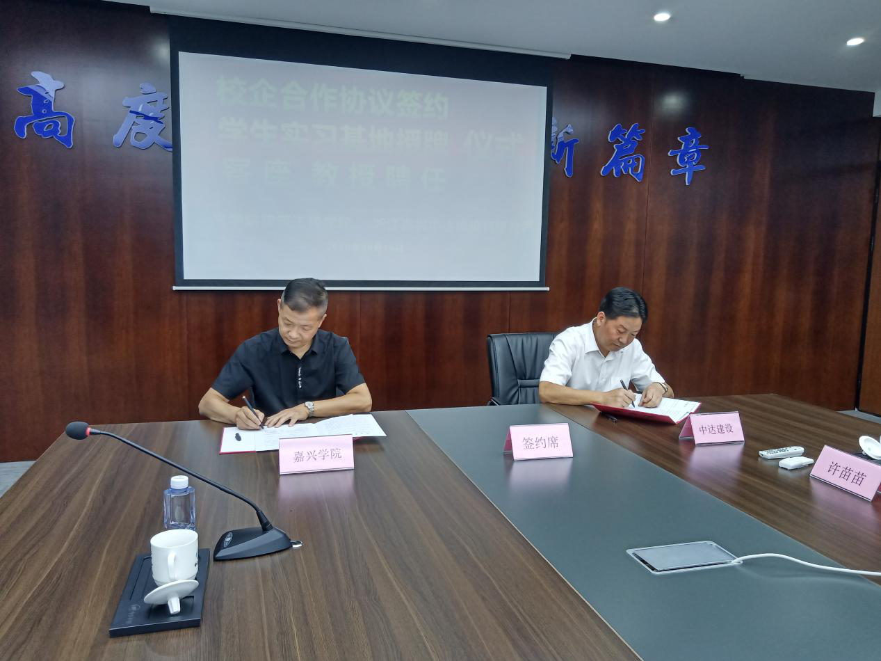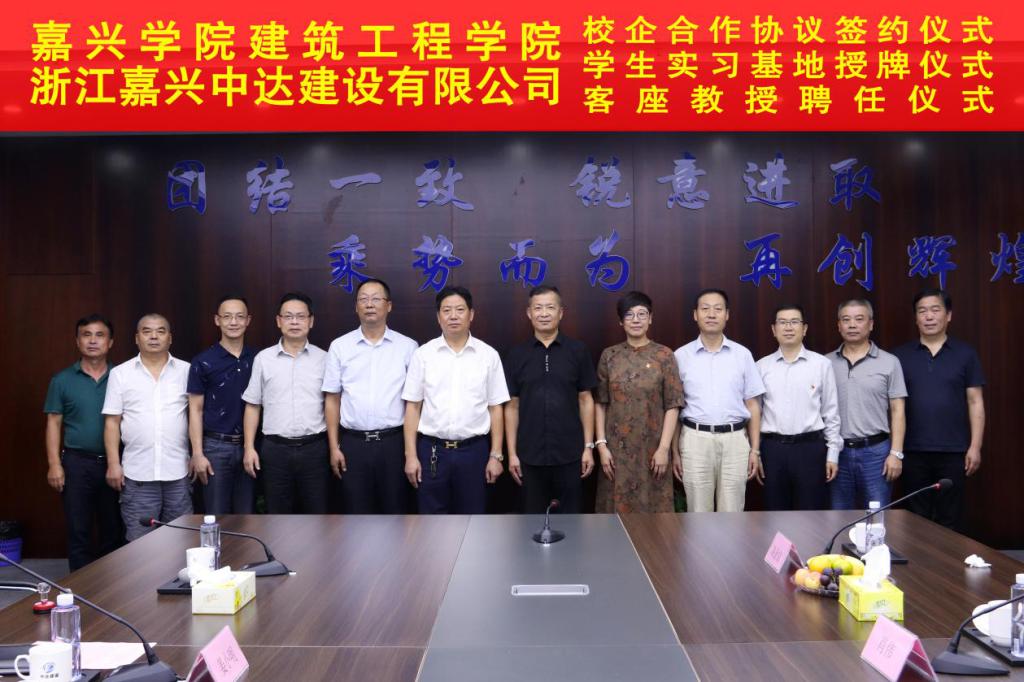 仪式上,由马嵘院长宣读客座教授聘任书,并为中达建设常务副总经理潘雪明颁发客座教授聘书;校企合作协议由马嵘院长与浙江嘉兴中达建设有限公司总经理肖国生共同签订;院党委书记费锦红向浙江嘉兴中达建设有限公司总经理肖国生颁授实习基地牌匾。仪式由中达建设行政办主任姜小明主持。