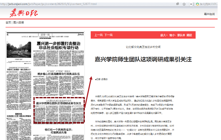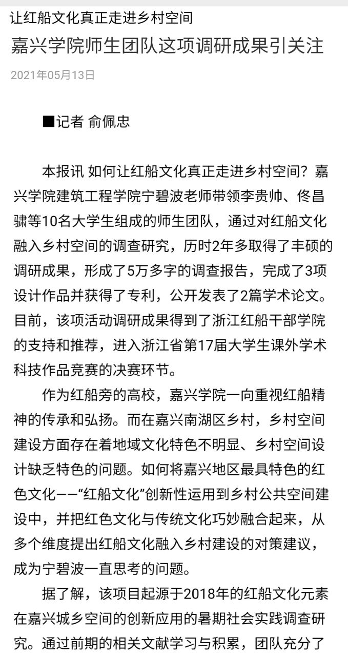 近日,后宫电影院 宁碧波老师带领李贵帅、佟昌骕等10名大学生组成的师生团队的调研成果受到社会关注,2021年5月13日嘉兴日报的第4版以“嘉兴学院师生团队这项调研成果引关注--让红船文化真正走进乡村空间”为标题,对该师生团队的调研成果进行了比较详细的报道。