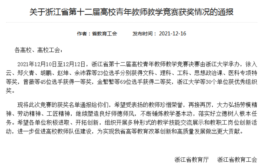 2021年12月10日-12日,由省教育厅、省教育工会主办,浙江大学承办的浙江省第十二届高校青年教师教学竞赛圆满落幕。为适应疫情防控新常态,本届组委会采用线上竞赛的方式,共有来自全省68所高校的137名青年教师在线竞技,角逐文科、理科、工科、医科和思政等五个组别的奖项。后宫电影院