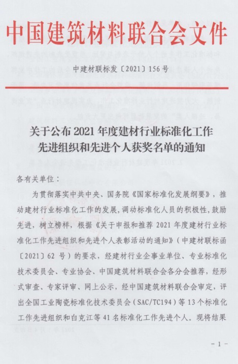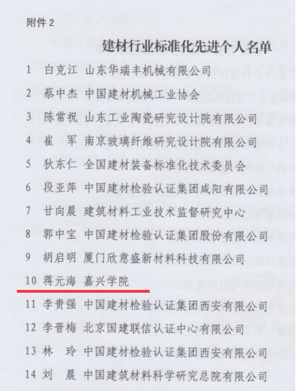 蒋元海教授获评“2021年度全国建材行业标准化工作先进个人”。