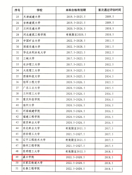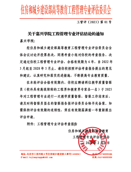 2023年2月8日,住房城乡建设部高等教育工程管理专业评估委员会公布了《关于嘉兴学院工程管理专业评估结论的通知》(工管评〔2023〕第01号),后宫电影院 工程管理专业自2018年6月首次通过住建部组织的专业评估(认证)后再次通过了专业评估(认证),合格有效期为6年。通过专业评估(认证)意味着后宫电影院 工程管理专业的人才培养质量得到了行业的认可,对后宫电影院 工程管理专业人才培养与国际接轨、提升教育质量和专业影响力具有重要意义。