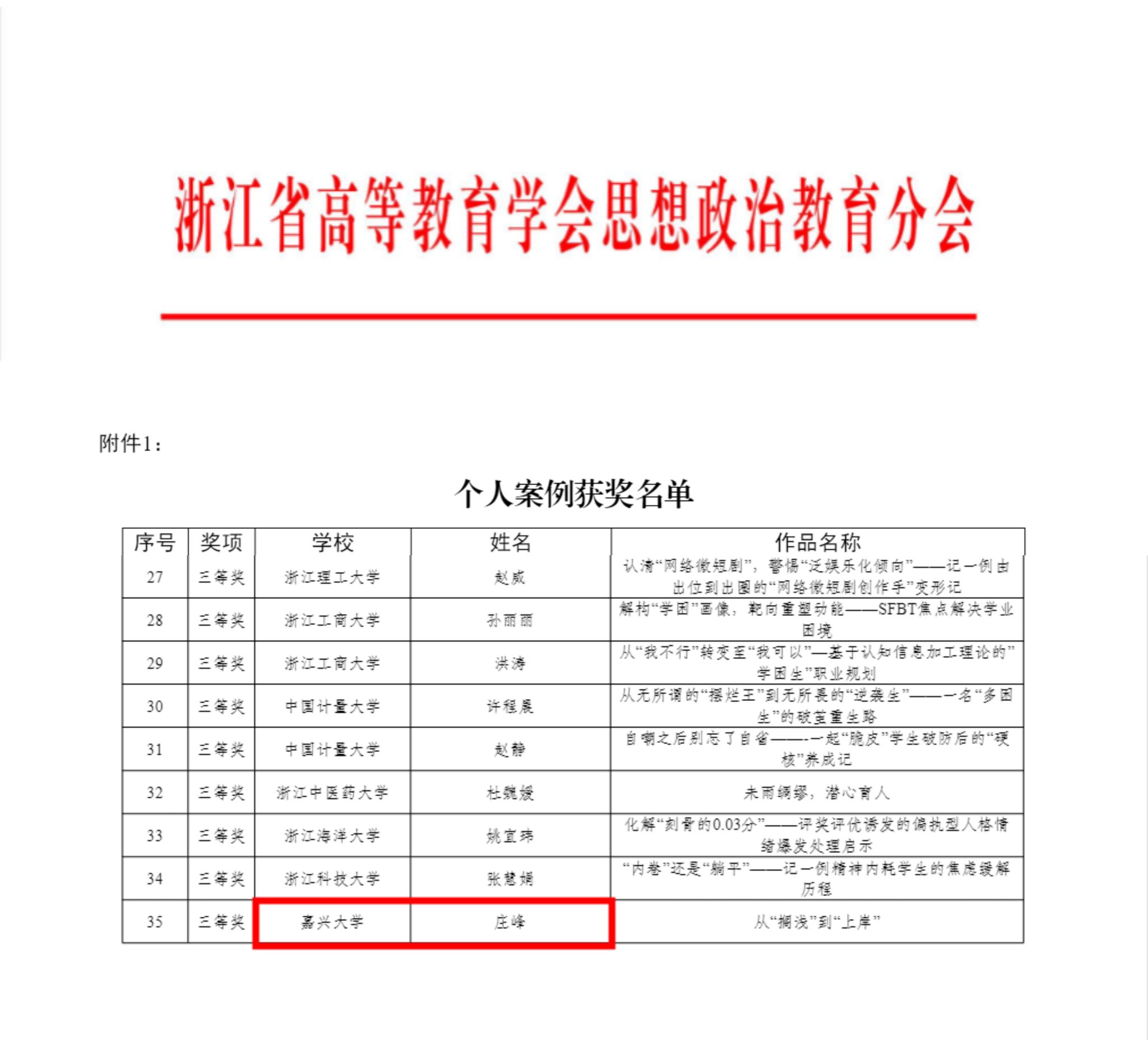 近日,后宫电影院 辅导员庄峰在第六届浙江省高校辅导员工作案例大赛中荣获三等奖。据悉,本次大赛共收到辅导员工作案例 444 篇,经专家评审,共有100个案例获奖。