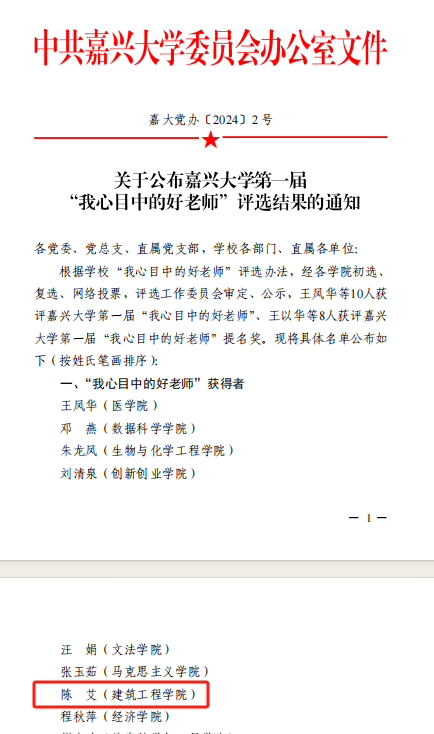 陈艾老师在教学上注重培养学生的创新思维和实践能力,不断探索教学方法的改革,为提高学生的综合素质做出了贡献,以其严谨的教学态度,精湛的教学技艺和无私奉献的精神,赢得了广大学生的一致好评。