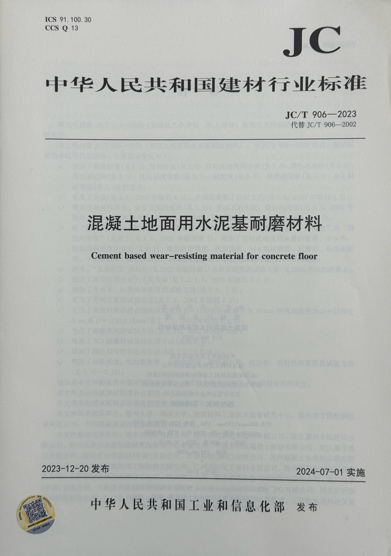 《混凝土地面用水泥基耐磨材料》(JC/T 906-2023)建材行业标准规定了混凝土地面用水泥基耐磨材料的分类和标记、原材料、技术要求、试验方法、检验规则等,进一步梳理、补充和修订了产品分类、标记、基准砂浆的水泥等级、骨料含量及耐磨度等要求,新增了BCA耐磨等级、环保、安全、颜色保持性及试验方法等要求。不仅提升了产品的整体性能,也更加注重环保和安全因素。此次标准的发布,将推动混凝土地面用水泥基耐磨材料行业的技术进步和产业升级,为消费者提供更加优质、环保、安全的产品选择。