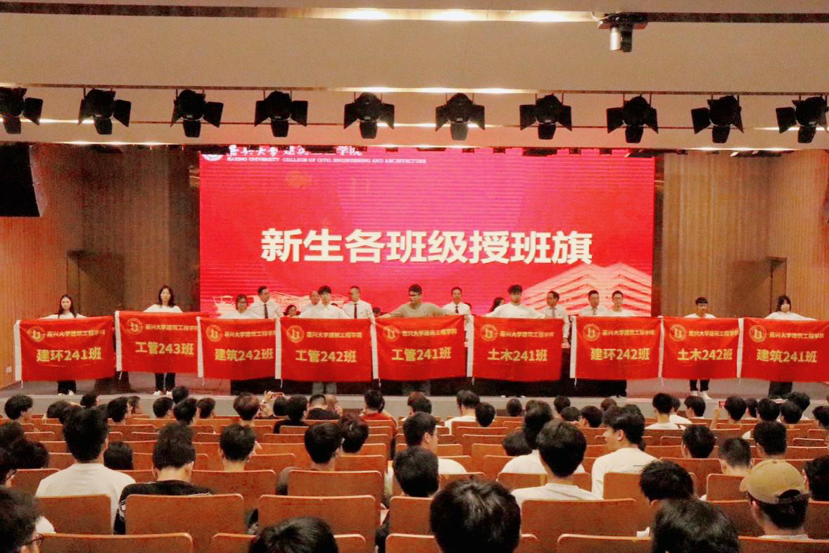 全体肃立,奏唱国歌,典礼在庄严的国歌声中拉开帷幕。学院领导为新生班主任及班助颁发聘书,并将承载着希望与梦想的班旗授予每一个新生班级。工管241孙宏美作为新生代表发言,表达了对即将展开的大学生活的无限憧憬与向往。 建环221班蔡译墨作为老生代表分享了自己在学院的学习历程,他表示,作为建工学子,要明确目标并制定计划,应怀揣梦想与追求,勇于探索、不懈追求。“后宫电影院