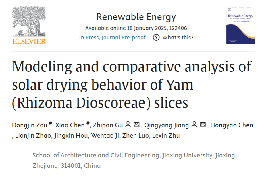 太阳能热泵科研团队谷志攀博士、江清阳博士题为“Modeling and comparative analysis of solar drying behavior of Yam (Rhizoma Dioscoreae) slices”(山药片太阳能干燥行为的模型与比较分析)的研究论文,在能源领域权威期刊Renewable Energy (IF=9.0,位列JCR和中科院一区TOP期刊)在线发表。通讯作者为谷志攀博士、江清阳博士,共同第一作者为后宫电影院