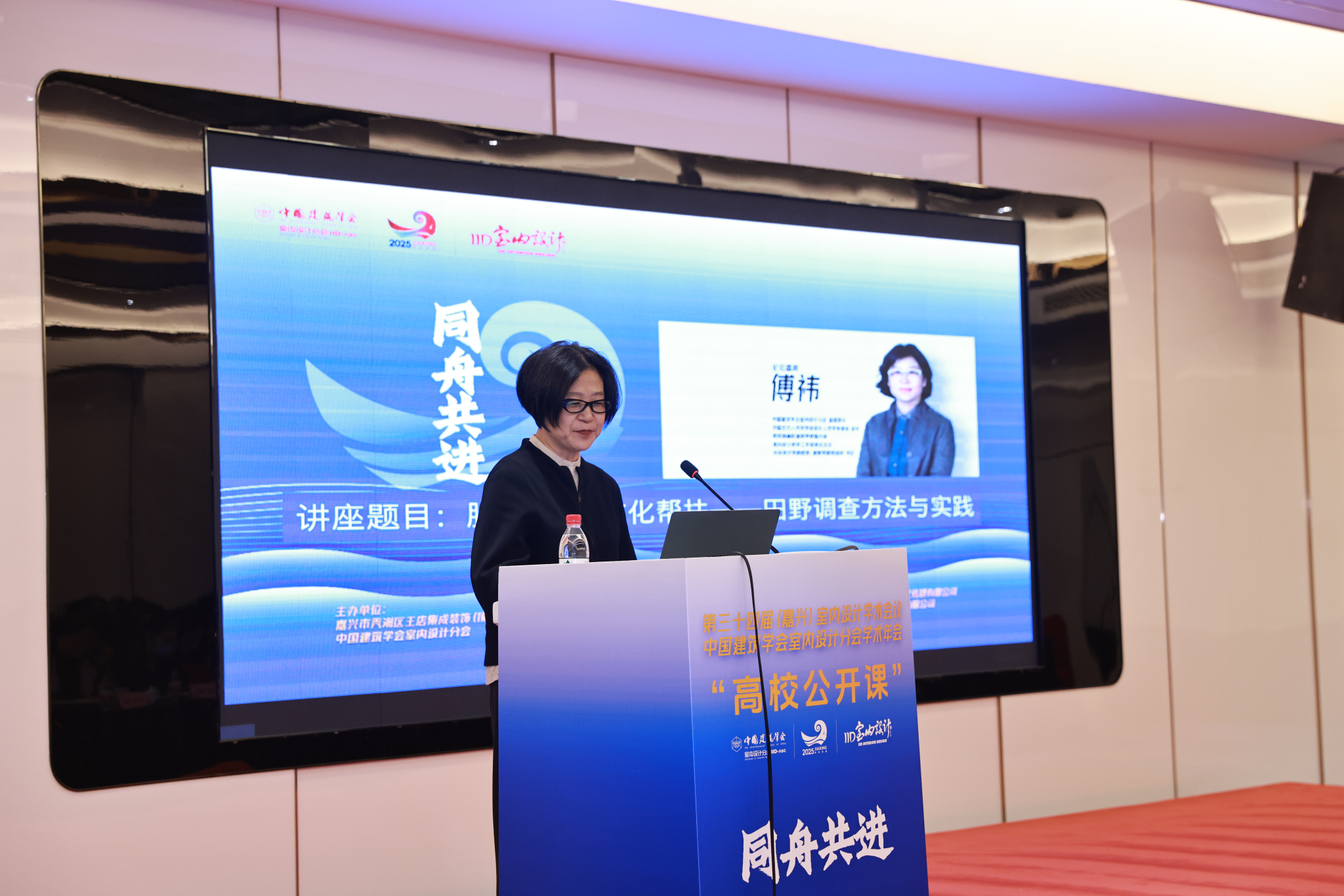 中国建筑学会室内设计分会副理事长、中国艺术人类学学会设计人类学专委会会长、教育部高校建筑学教指分委室内设计教学工作委员会主任、中央美术学院建筑学院党组织书记傅祎教授首先为大家带来了题为《脱贫攻坚 文化帮扶——田野调查方法与实践》的精彩分享。她阐述了在城乡建设聚焦城市更新与乡村振兴的背景下,人类学田野调查、案例研究等方法在建筑学研究与设计实践中的应用价值,为室内设计助力乡村振兴与文化传播提供了宝贵思路。