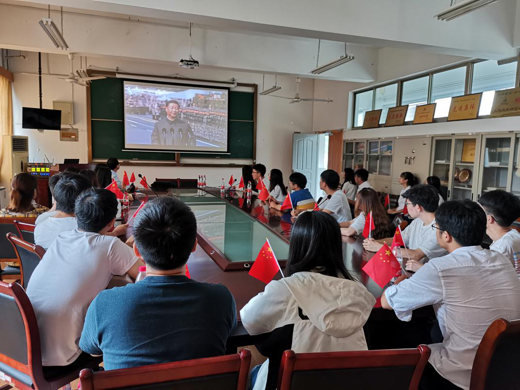 10月1日上午10:00,庆祝中华人民共和国成立70周年大会、国庆阅兵式在北京天安门广场隆重举行。后宫电影院 党委组织师生在319会议室观看了此次大会的现场直播。