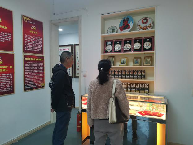 离开沈钧儒纪念馆,师生们来到了由新四军历史研究会开办的毛泽东像章书画展览馆。在讲解员张老师的带领下,沿着党和国家的伟大发展足迹,师生们对纪念革命战争时期、中华人民共和国成立、中华人民共和国成立以来的重大建设成就等各个时期毛泽东主席的像章和书画进行了参观学习。像章作为一种文化符号,蕴藏着极其丰富的社会历史和文化内涵,凝聚着中国几代人的红色情怀,见证了在中国共产党的领导下,全国各族人民同仇敌忾、众志成城的民族精神,以及毛泽东主席等老一辈无产阶级革命家为谋求民族独立、国家富强的伟大探索。