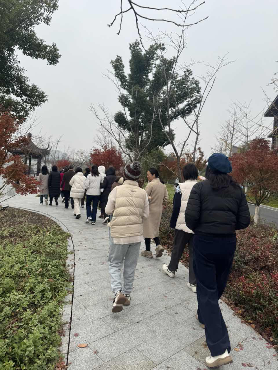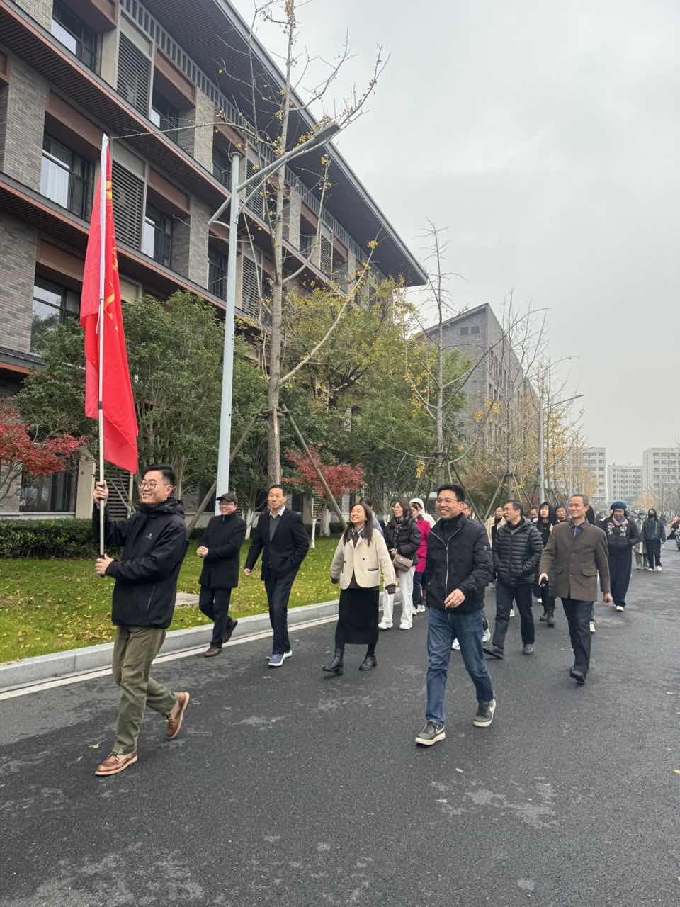 楼前集合出发,精神抖擞,健步前行。健步走的路线贯穿了校园的多个标志性建筑,包括厚德楼、明德楼、梅园、荷园、一期操场、兴礼楼、行政楼、图书馆、融信楼、梁林二期篮球场。一路上,教职工们漫步于校园美景之中,时而互动交流,欢声笑语。鲜艳的院旗,矫健的步伐,为冬日的校园增添了一道亮丽的风景线。
