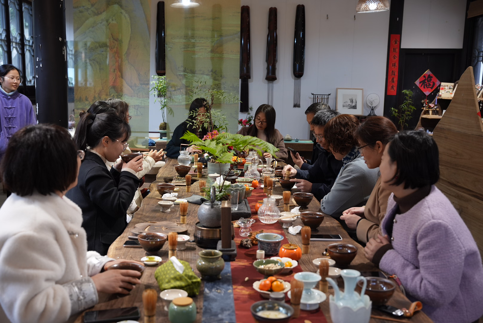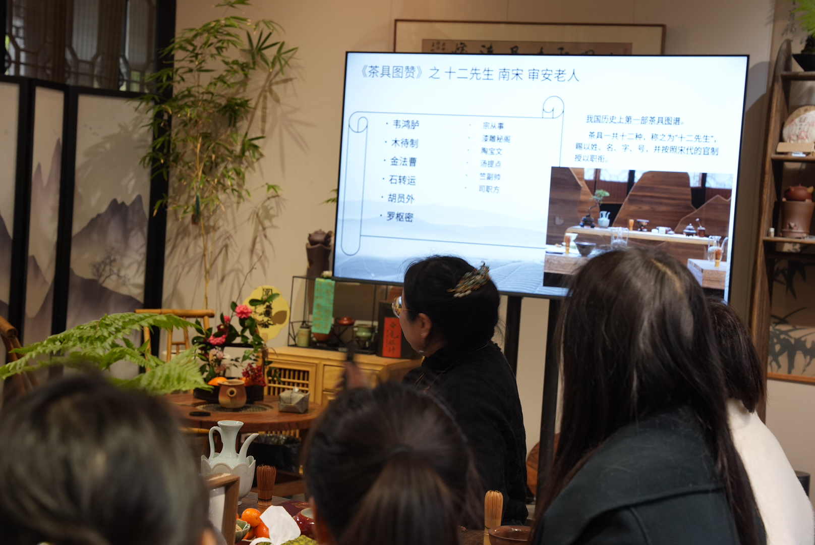 活动现场,受邀而来的点茶老师身着传统服饰,从宋代点茶的历史渊源、文化内涵讲起,生动描绘了宋代点茶在士大夫阶层、市井坊间的盛行景象,让大家对这一传统技艺有了深入了解。