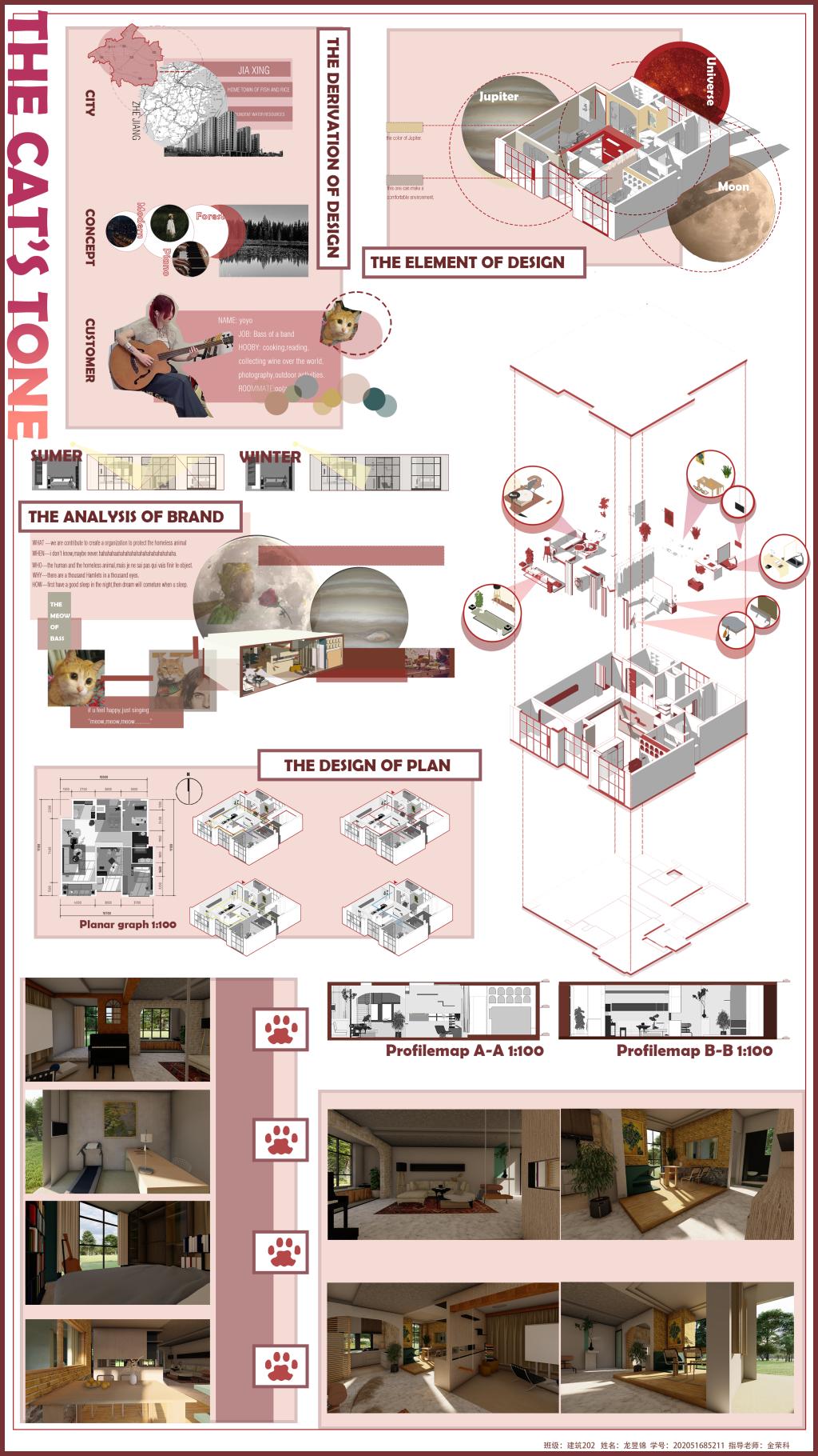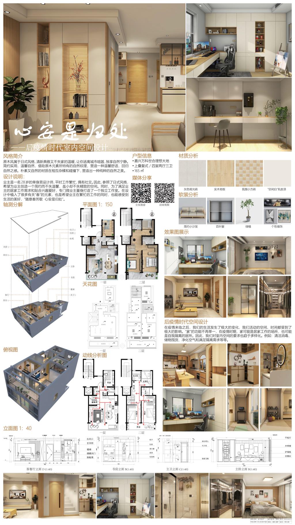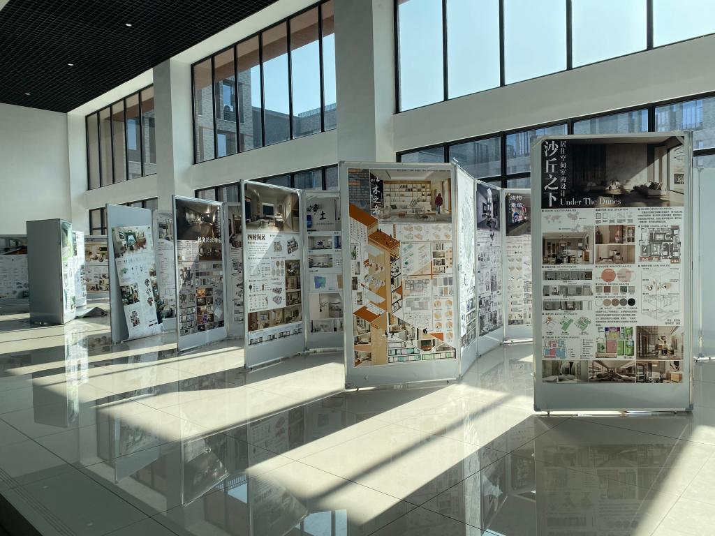 二楼中庭举办了主题为“居住空间室内设计”的作品展。参加此次展出的为建工学院建筑学系金荣科和彭昕两位老师指导的建筑201、202班的学生作品,以及设计学院环境设计系赵斌老师指导的环艺20级的学生作品,总计78件空间设计类作品。作品选题均来自于嘉兴本地及周边地区的真实项目,是学生通过对于实际场地的了解,对于客户对象的分析,通过多次反复讨论和修改后推敲出来的具有创新性和实际落地性的空间设计作品。