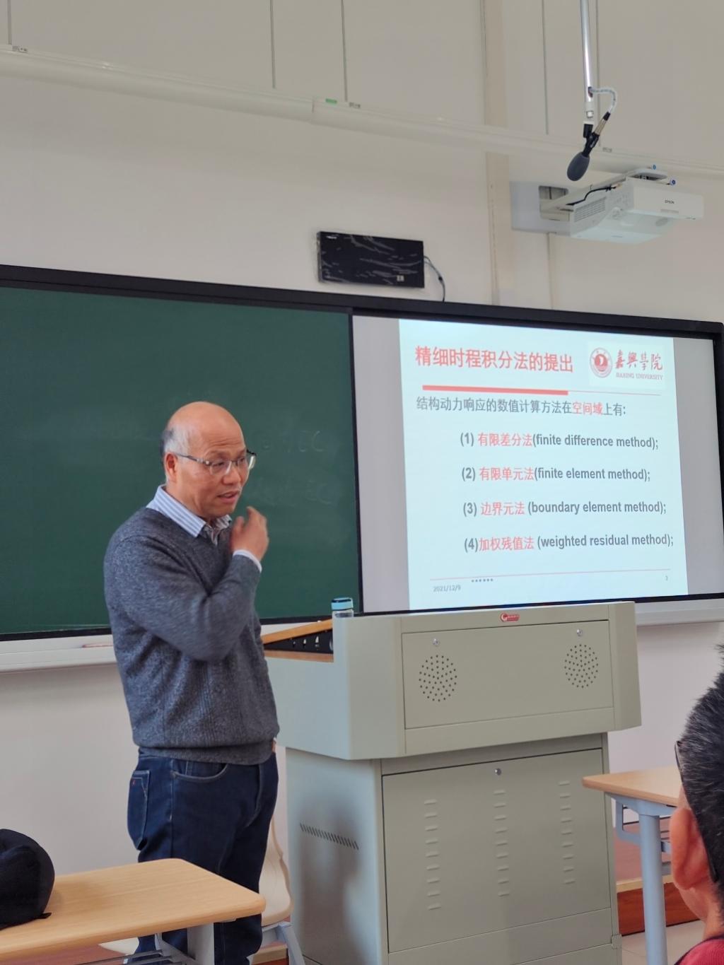 与此同时,土木系梅甫良教授对相关师生们作了《精细时程积分法及其在土木工程中的应用》的报告,从精细时程积分法的背景和研究进展;精细时程积分法的优点和实施;精细时程积分法在土木工程数值计算中的应用三方面展开讲述,获得了师生们良好的反响。
