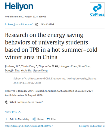 为第一署名单位,建工学院建环21级李嘉盛、曾尹鑫同学为论文共同第一作者,建环系谷志攀老师为通讯作者,建环专业陈鸿耀、陈肖、邹东晋、刘雨蝶、邓李缘同学为论文合著者。