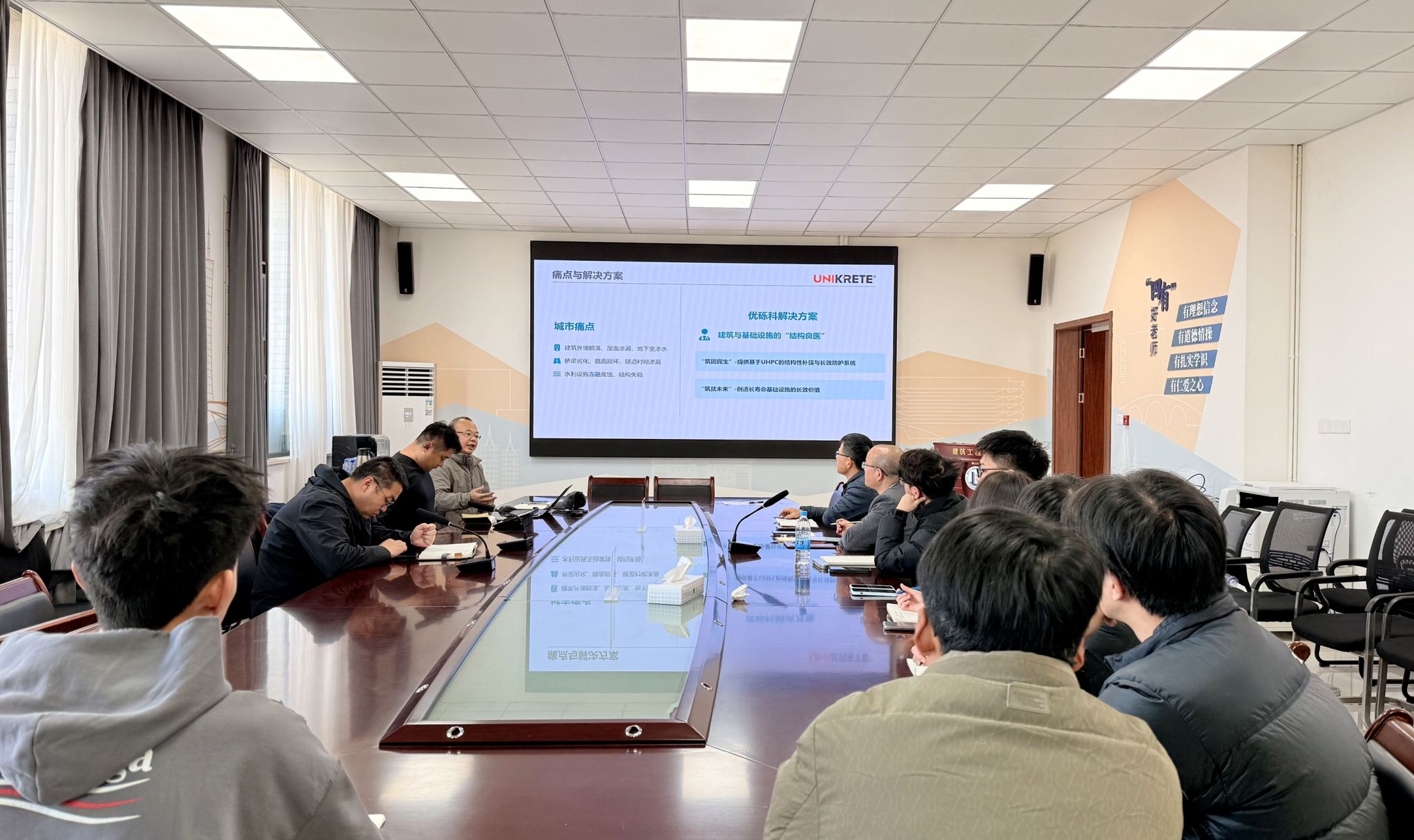 蒋勇总经理聚焦国家“城市更新”“好房子”建设等政策导向,结合建筑外墙脱落、水利设施冻融腐蚀等行业长期痛点,系统分享了UHPC技术从实验室原理到工程现场落地的全链条转化路径,为研究生提供了“学术研究-技术创新-产业应用”融合的典型范例。