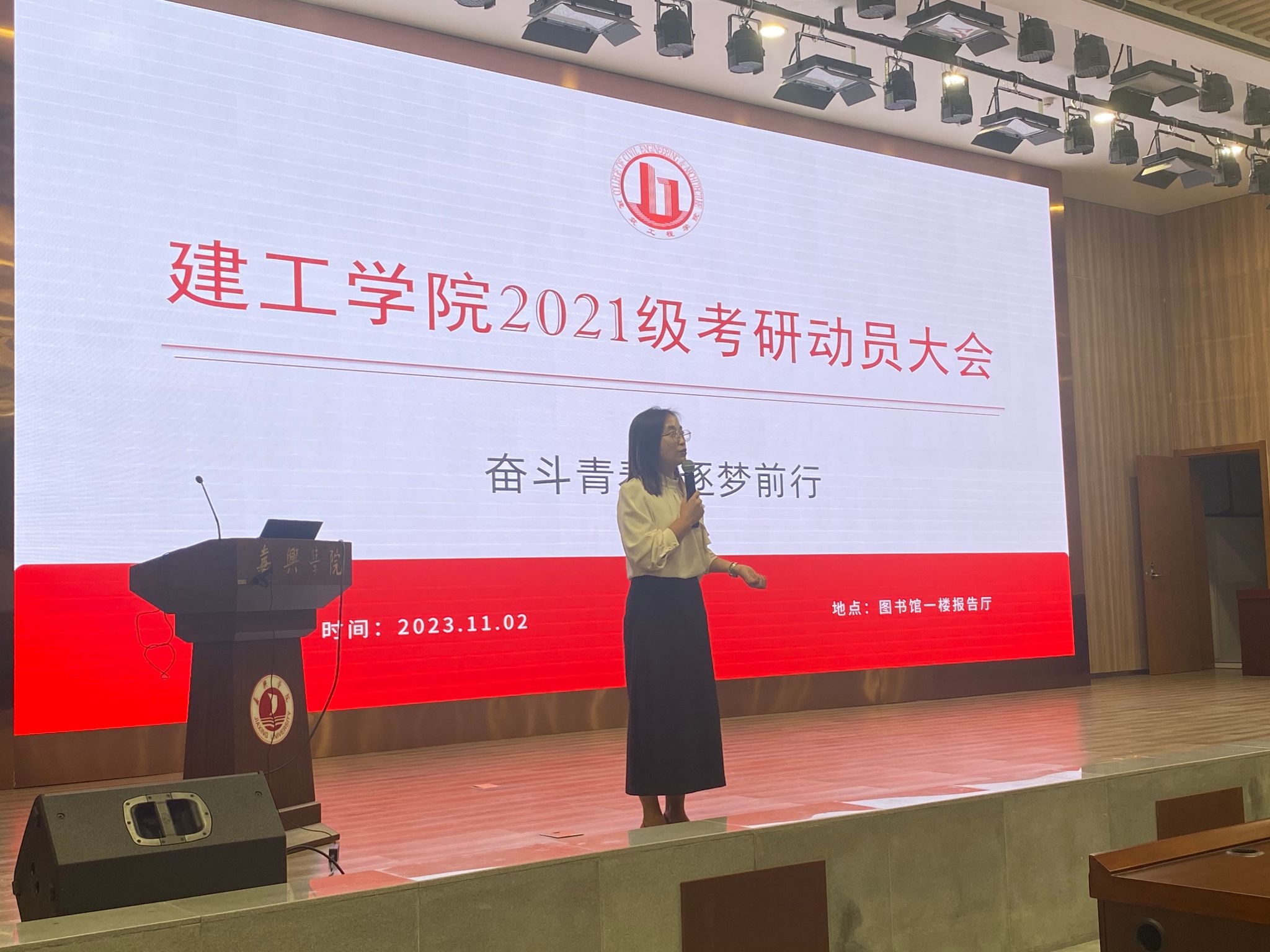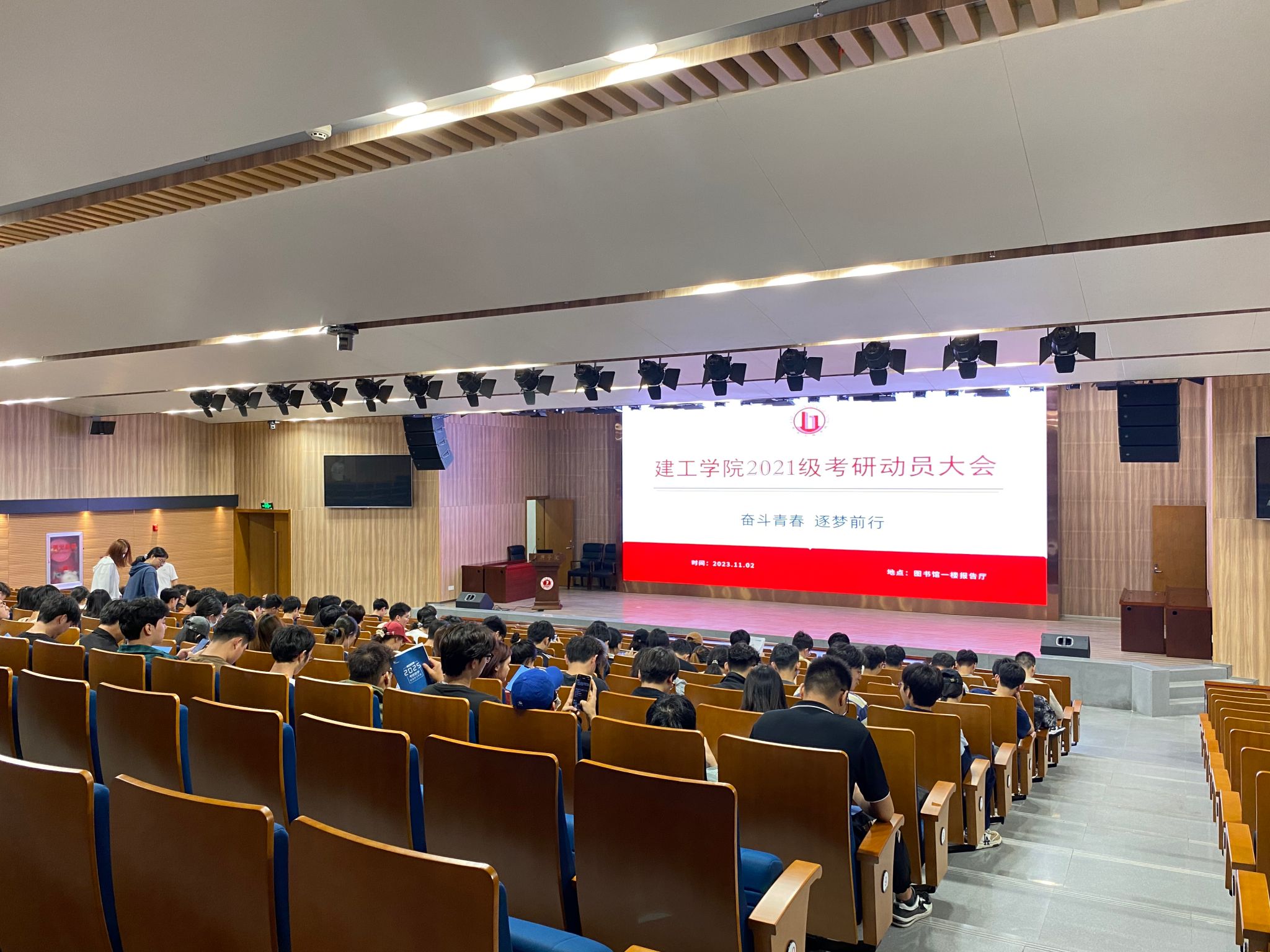 在图书馆一楼报告厅召开2021级学生考研动员大会,此次会议邀请了启航考研规划辅导名师、GCDF 全球职业规划师董良才。学院党委副书记杨智慧,就业辅导员庄峰及2021级全体学生参加了动员大会。