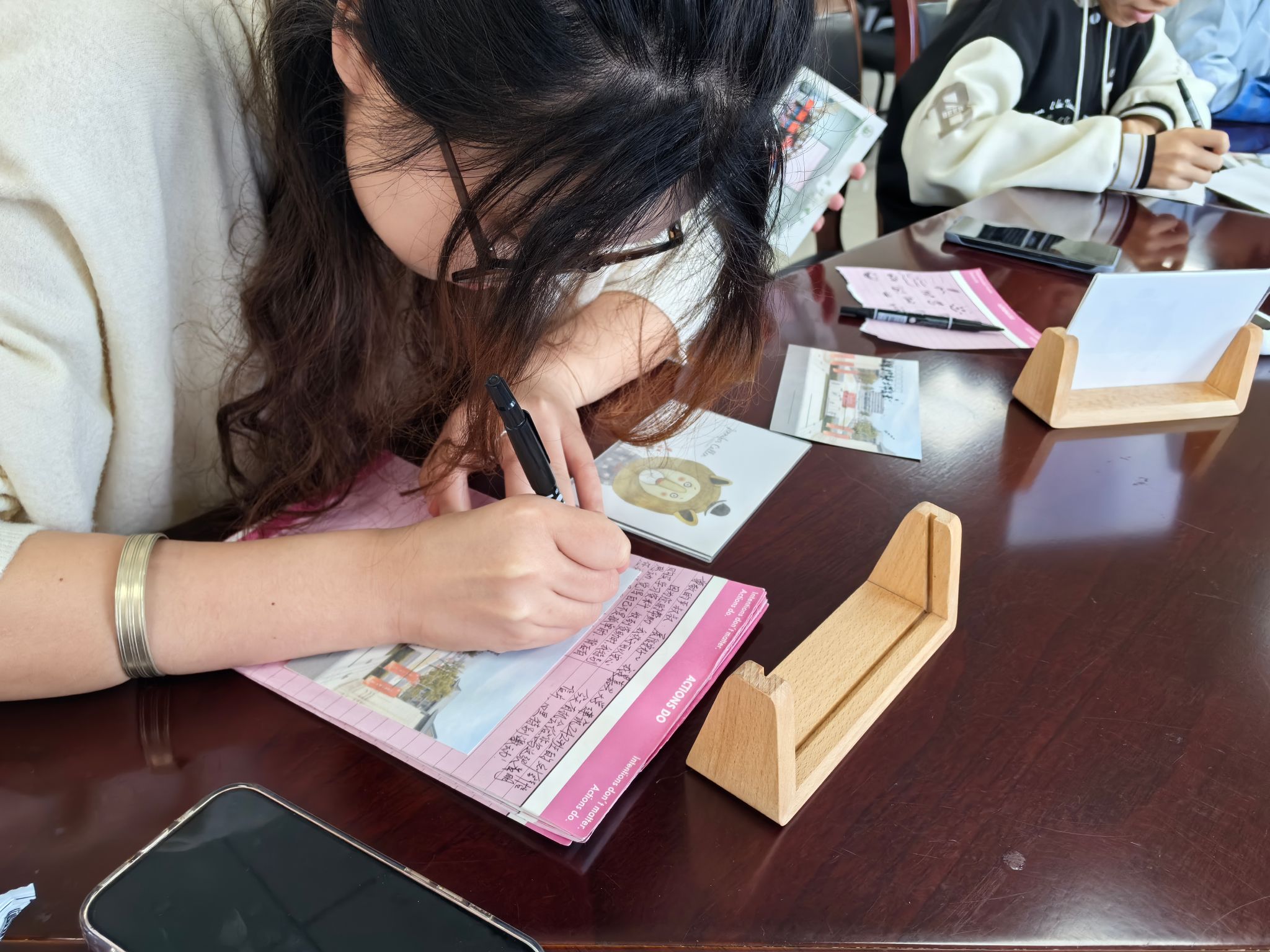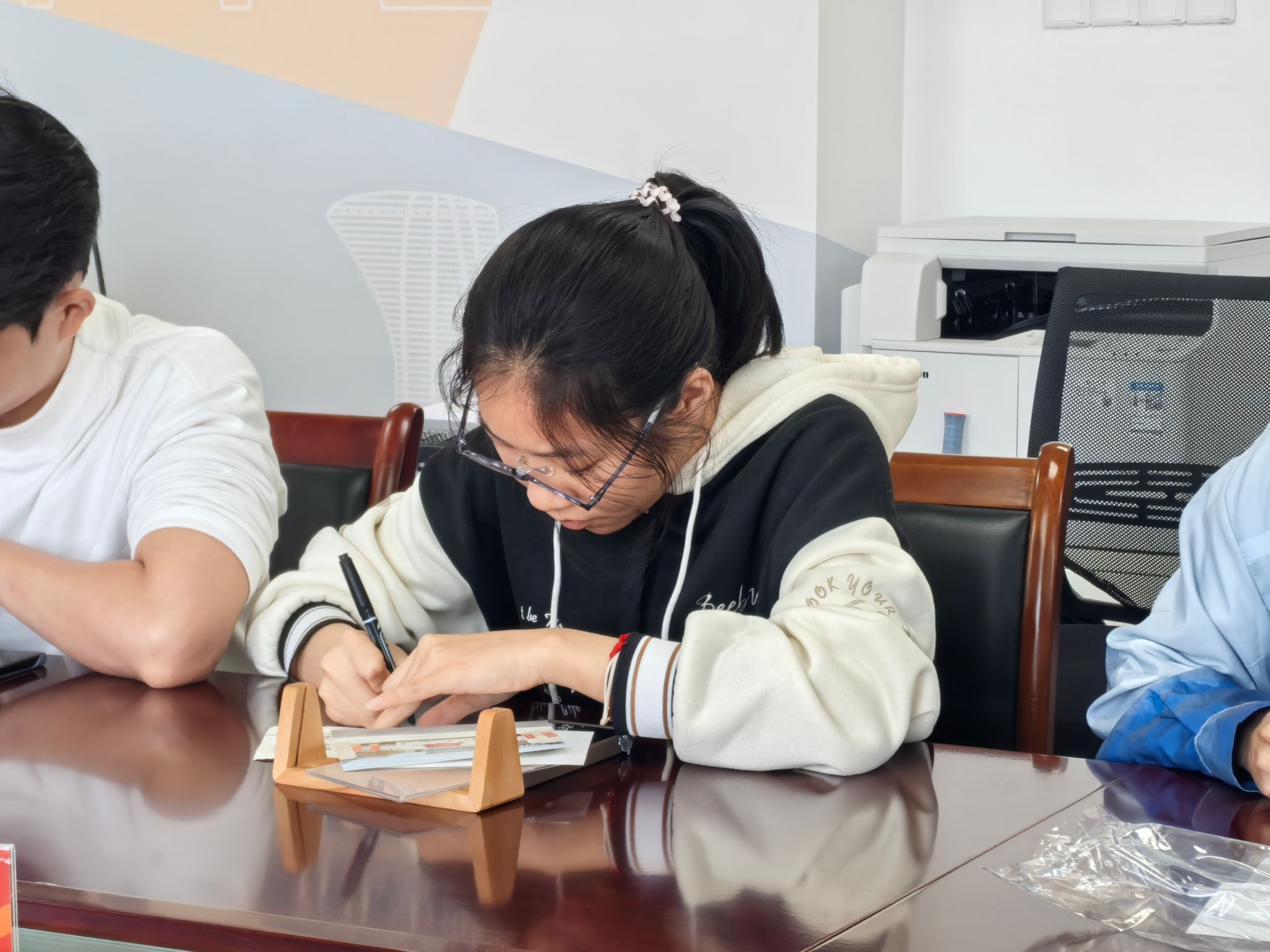 会上,同学们精心制作了感恩明信片。他们手握画笔,神情专注而认真,将内心的感激之情倾注于笔尖,在明信片上用真挚的话语书写着对资助人的祝福,每一笔勾勒、每一字书写,都是学生们内心感恩之情的真实写照。完成创作后,同学们还特意用相框和亚克力板将明信片精心装裱,力求以最完美的形式,将这份心意传递给资助人。