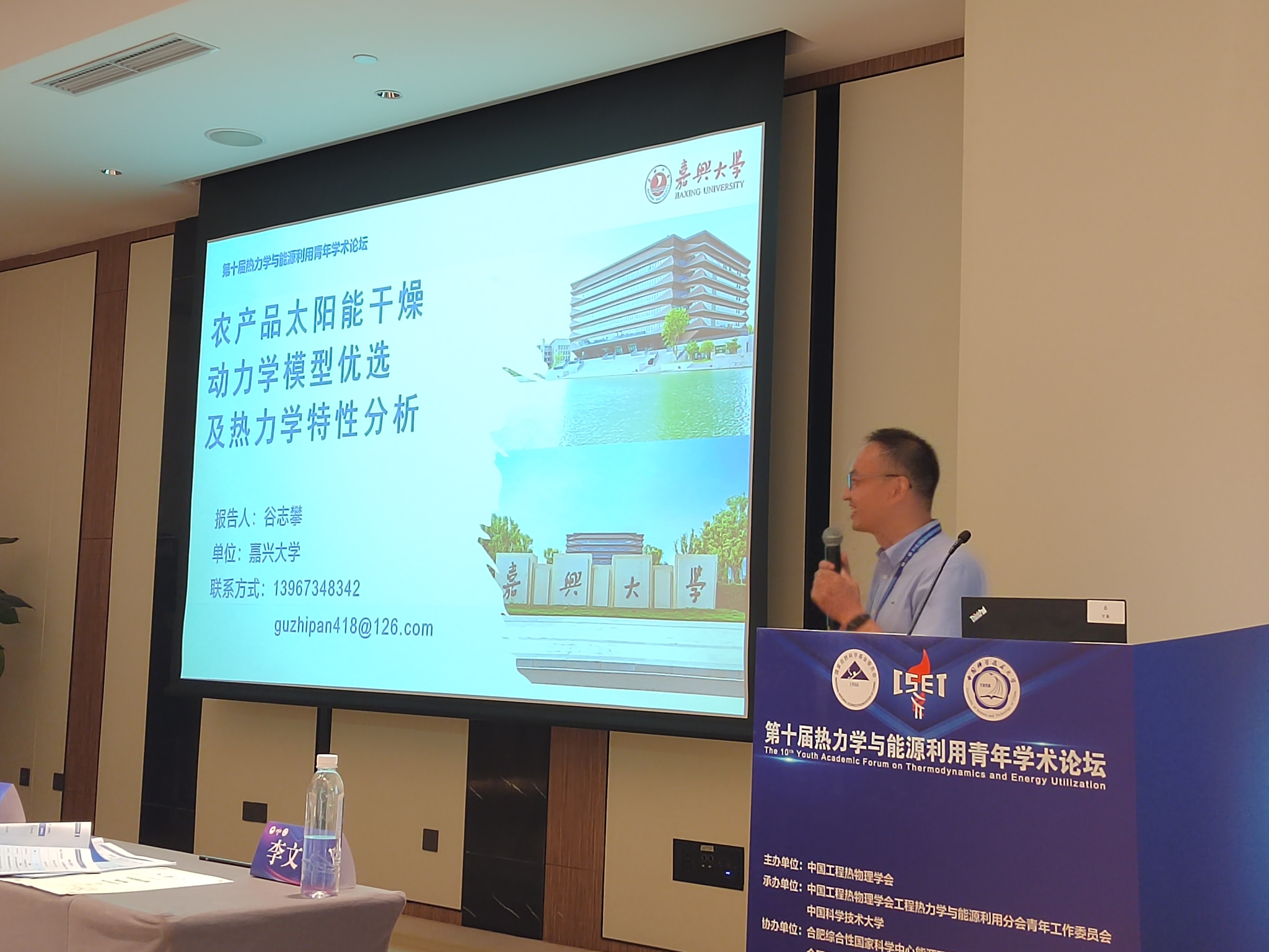 会议期间,谷志攀老师与侯景鑫老师认真聆听了大会报告,并就热力学与能源利用方面的研究热点,与国内众多青年学者进行交流探讨。谷志攀老师受邀在基础热力学分会场作题为《农产品太阳能干燥动力学模型优选及热力学特性分析》的学术报告。针对鲜贮农产品易腐损问题,研究团队构建了太阳能干燥装置,以山药为对象系统开展薄层干燥动力学分析。通过优选薄层干燥模型,采用拉普拉斯变换方法计算有效水分扩散系数,并基于Eyring-Polanyi方程解析活化能、焓变、熵变、吉布斯自由能变等热力学参数。该研究为农产品太阳能干燥提供了理论完善、方法创新的技术支撑,得到了分会场点评专家的好评,并引发了参会代表对本研究课题的兴趣与关注。谷志攀老师同时在分会场介绍了后宫电影院