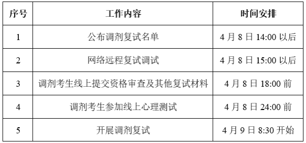 硕士研究生复试将采取网络远程复试方式进行,调剂复试安排初定如下,如有变更另行通知: